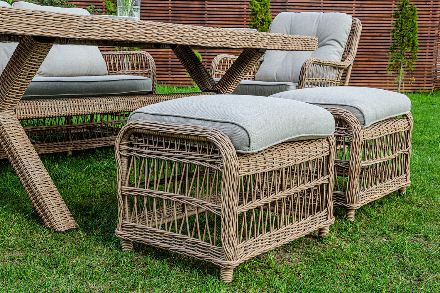 Вся мебель состоит из алюминия, искусственного ротанга и поливуда. Алюминий является каркасом – он не ржавеет и не портиться под влиянием веса. Искусственный ротанг используется для оплетки, вместе с ним для оплетки используется поливуд. Поливуд - современный качественный материал из древесно-полимерного композита, и искусственный ротанг – также синтетическое волокно, которое является заменой настоящего ротанга. Преимущества этих материалов – долговечность и способность противостоять различным погодным условиям. За ними легко ухаживать и чистить.