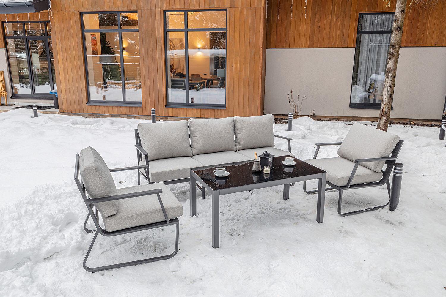 Мебель вся состоит из алюминиевого каркаса – прочного и надежного материала, окрашенного в элегантный черный цвет. Столешница состоит из закаленного прозрачного стекла – такого же прочного и красивого материала. Мебель может использоваться при температуре от -30 до +50 градусов – отлично подойдет для морозных зим и жаркого лета. Спинки кресел и дивана чуть откинуты, а мягкие элементы обеспечивают настоящий комфорт. Просторные сидения позволят сидеть даже с закинутыми ногами. Внешний вид набора – минималистичный вид, черные ножки и подлокотники, вместе с светло-серыми подушками.