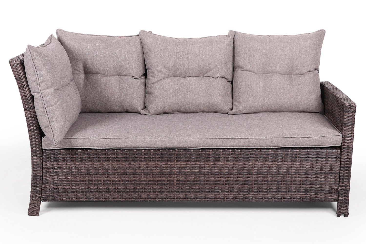 Набор представляет собой угловой диван и стол в одном стиле коричневого цвета с подушками и матрасом серо-коричневого цвета. Вся конструкция состоит из стали (каркас), искусственного ротанга (декоративный элемент, похожий на переплетение дерева, но на самом деле состоит из синтетических волокон, которые отлично выдерживают нагрузки от природных условий) и закалённого стекла (рабочая поверхность стола). Подушки и матрас имеют съемные чехлы из 100% полиэстера, материала с такими полезными свойствами, как водонепроницаемость, прочность и долговечность.