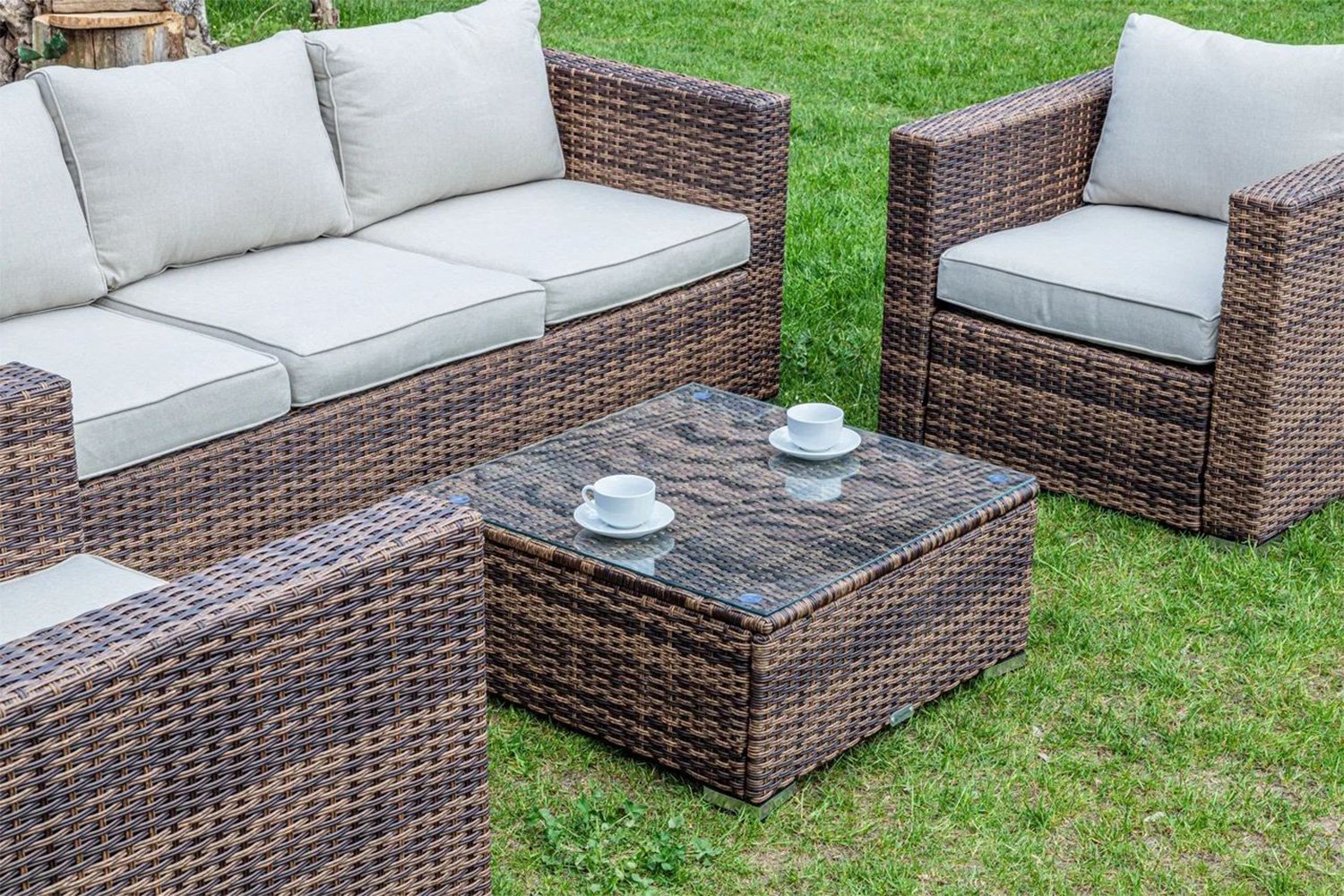 Вся мебель состоит из стального каркаса, оплетенного искуственным ротангом коричневого цвета. Спинки кресел и дивана низкие, имеют прямую форму. Присутствуют широкие подлокотники. Низкая мебель не привлекает внимание и не крадет пространство. Размеры мебели: стол - 165х69х90 см, кресло (в наборе 2 штуки) - 85х66х84 см, диван - 204х66х84 см. Форма стола – прямоугольная, столешница состоит из плотной оплетки, покрытого прозрачным стеклом.