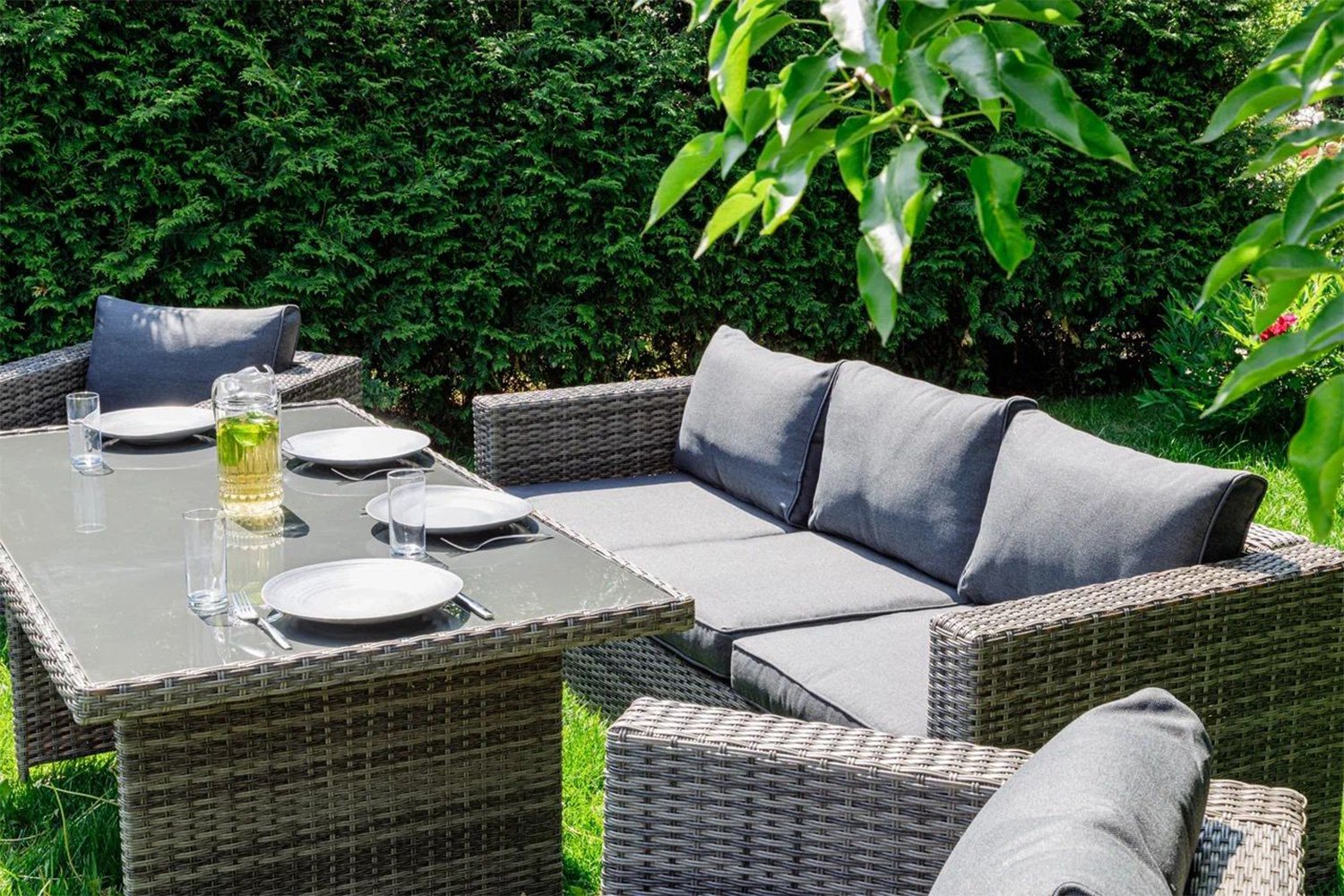 Увеличенный по комплектации набор уличной мебели Karl plus серого цвета идеально подойдет для тех, кто часто устраивает посиделки на улице для большой компании. В набор входят два кресла 58х89х60 см (с короткой спинкой), два кресла с высокой спинкой 85х66х84 см, диван 204х66х84 см и обеденный просторный стол 165х69х90 см.