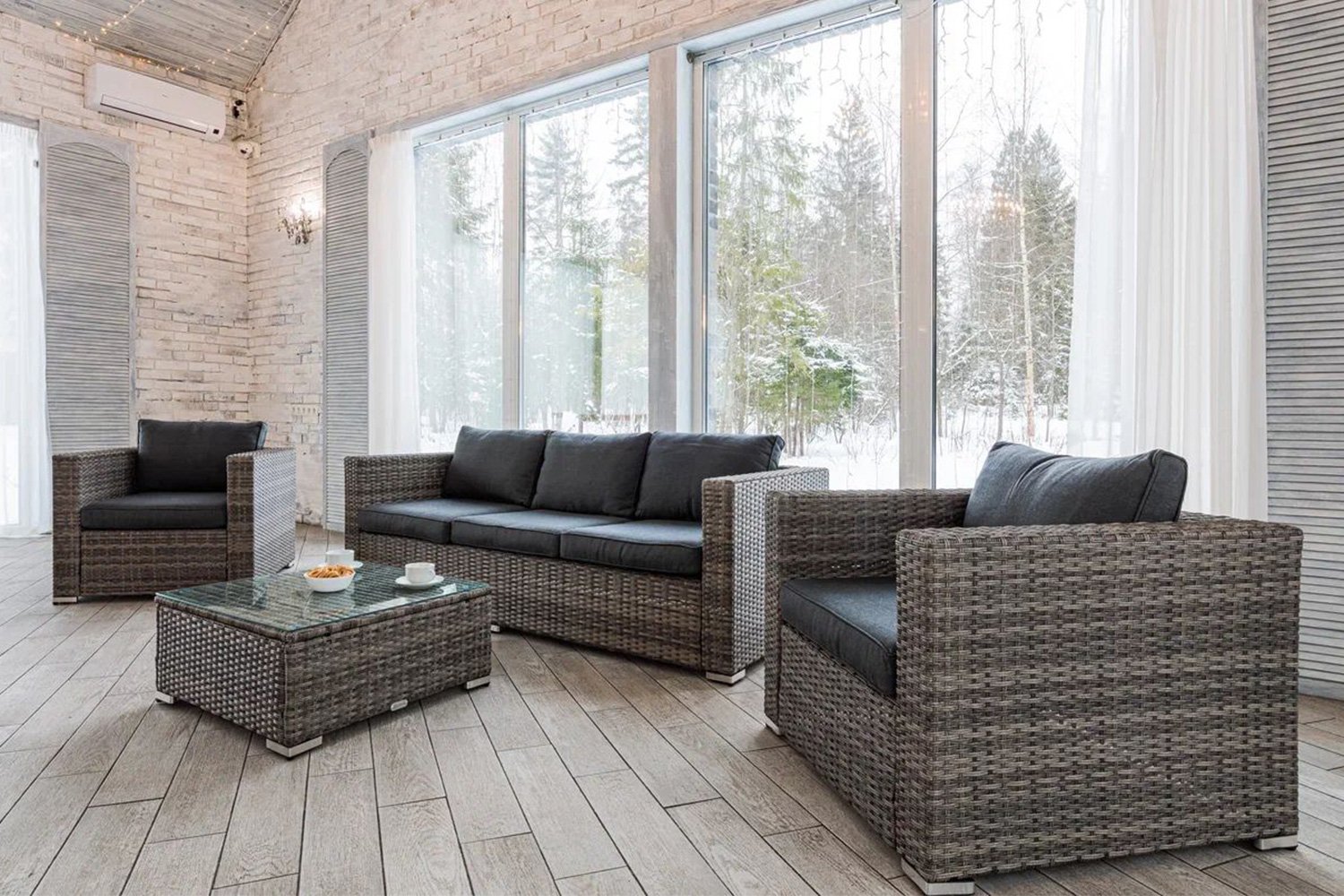 Мебель – важная часть любого обустройства пространства. И особенную роль она играет для зоны отдыха. Мебель «Карл» серого цвета – готовый набор мебели для размещения 5 человек в одном месте с небольшим столиком для напитков. Этот набор подойдет для использования в помещении, и даже на улице, причем в любой сезон – зима или лето.