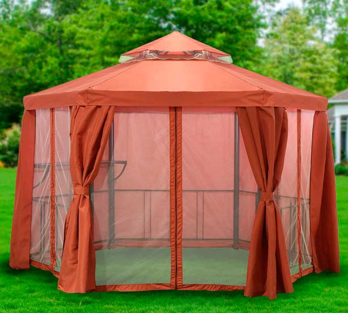У нас вы можете купить комплект, который, который предназначен на шатёр для дачи. В данный комплект входит крыша-тент с клапаном для циркуляции воздуха, москитная сетка, а также плотные шторы. Весь комплект выполнен в терракотовом цвете. Это отличный выбор для отдыха с комфортом, он пригодится всем тем, кто любит отдыхать на свежем воздухе. Крыша изготовлена из полиэстера с плотностью 160 г, боковые стенки из полиэстера 140 г с москитной сеткой. Будьте уверены, данный комплект прослужит вам не один сезон.